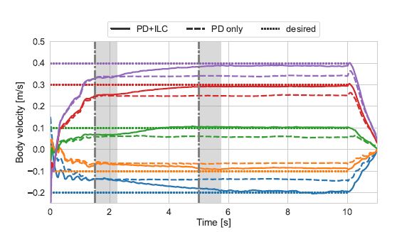 Finally, with both the PD-ILC, we were able to obtain good performance with velocity errors diminishing to under 5% after the ILC has kicked in.