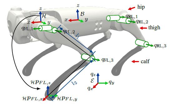 The first step was deriving a first principles, kinematic model of the Unitree Go1. Using the inverse kinematics equations derived from this allowed us to control individual foot positions in reference to the shoulder (hip) joints, forming the basis of the control strategy.